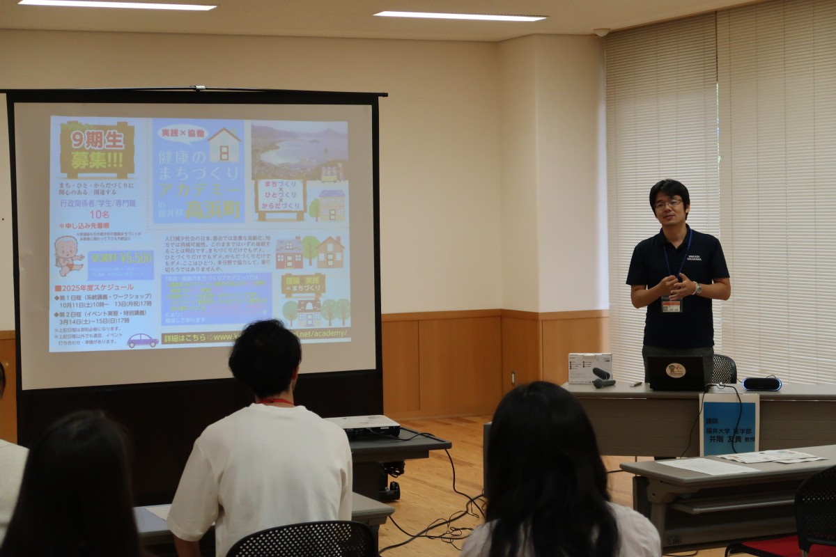 本セミナーは、健康のまちづくりに関心のある全国の学生や行政職員、専門職を対象として、福井大学地域づくりコンソーシアムの教員を中心に高浜町と共同で、健康のまちづくりについて幅広く学び、高浜町を舞台にイベントを実施する通年セミナーで、これまで76名の方が卒業されています。